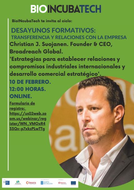 En esta sesión, Christian Suojanen nos hablará de las estrategias para establecer relaciones y compromisos industriales internacionales y desarrollo comercial estratégico, desde la perspectiva de su amplila experiencia como emprendedor y asesor en los sectores bio, farmacéutico, sanitario y tecnológico tanto a nivel nacional como internacional.