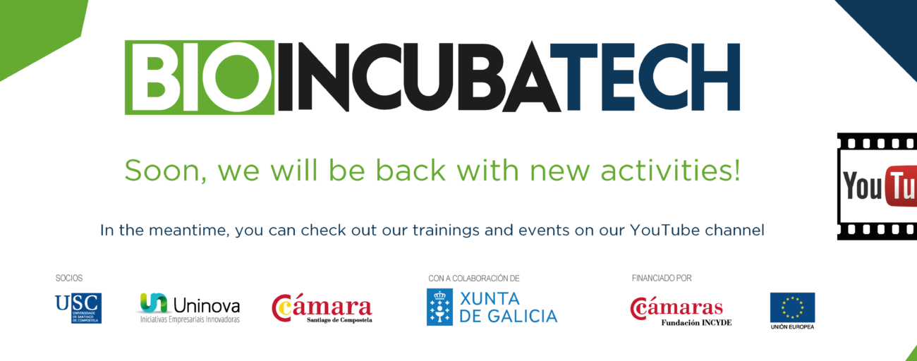 BioIncubaTech is an initiative of the University of Santiago de Compostela (Spain), funded by INCYDE Foundation and included in the 2014ES16RFOP001 Smart Growth FEDER Operational Program, through the Intermediate Body of the Chamber of Commerce of Spain.